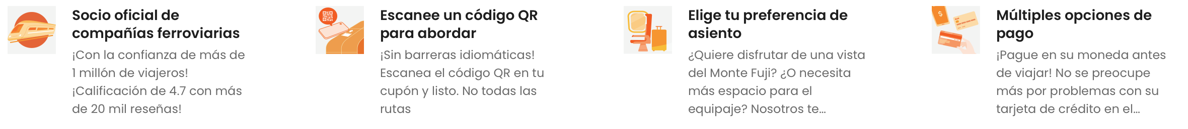 Klook te permite elegir tu tren, tipo de asiento y fecha de viaje, y los extras que quieras o necesites, todo en un solo lugar.